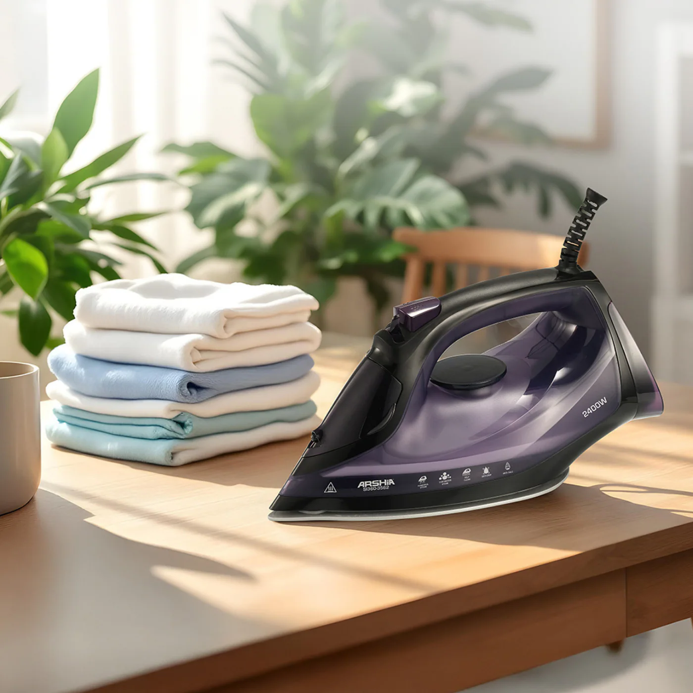 مكواة بخار تعمل بقدرة كهربائية تتراوح بين 2000 و2400 وات، تُسخّن بسرعة وتُستخدم للكي الفعّال على مختلف أنواع الأقمشة. تأتي باللون البنفسجي.