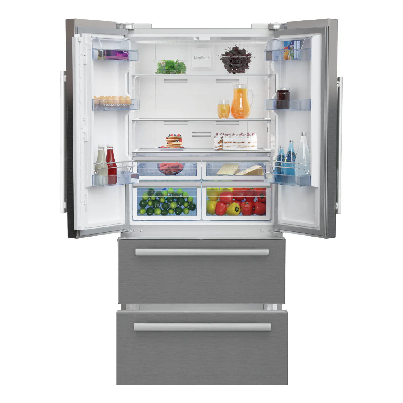 مزودة بـ 2 باب علوي لسهولة الوصول، و2 درج سفلي لتخزين المجمدات، بالإضافة إلى تصميم داخلي عملي يسمح بتنظيم المحتويات بكفاءة. اللون الخارجي ستانلس ستيل يمنحها مظهرًا عصريًا ومتينًا.