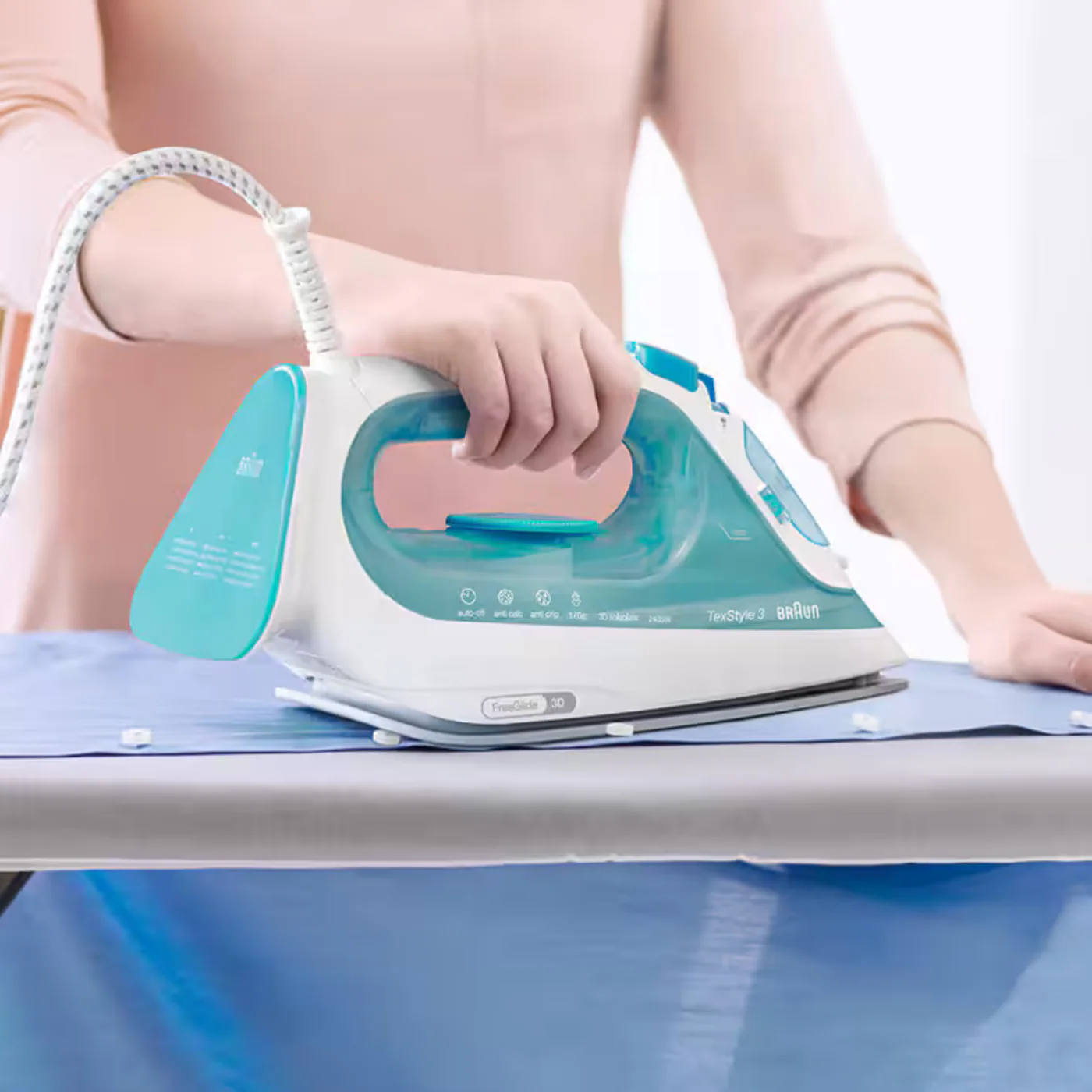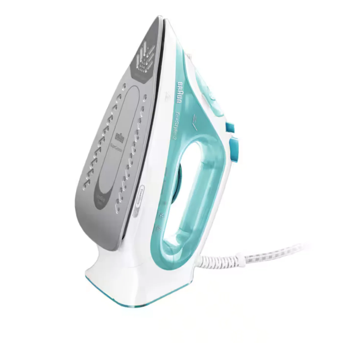 مكواة بخار من براون تعمل بقدرة 2350 وات، تُسخّن إلى أقصى درجة في **35 ثانية**. تأتي باللون الفيروزي، ومزودة بتقنية FreeGlide 3D لانزلاق سلس في جميع الاتجاهات.