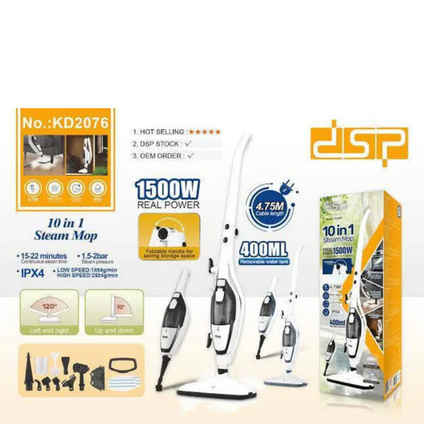 تعمل ممسحة البخار KD2076 بقدرة 1500 واط لتوليد بخار قوي خلال وقت تسخين سريع يتراوح بين 20 إلى 30 ثانية فقط، مما يساعد على إزالة الأوساخ، الدهون، والبقع الصعبة بكفاءة عالية من مختلف الأسطح.