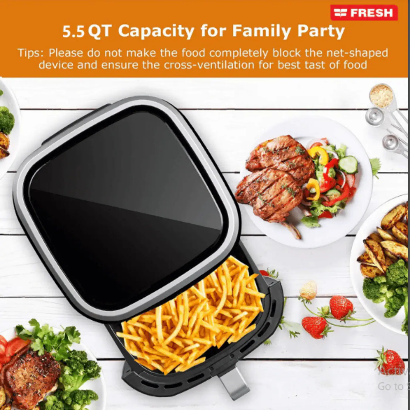 اير فراير فريش X-Large تمنحك تجربة طهي متقدمة باستخدام تقنية الحمل الحراري بالهواء لتقديم وجبات شهية ومقرمشة دون الحاجة لاستخدام الزيت.