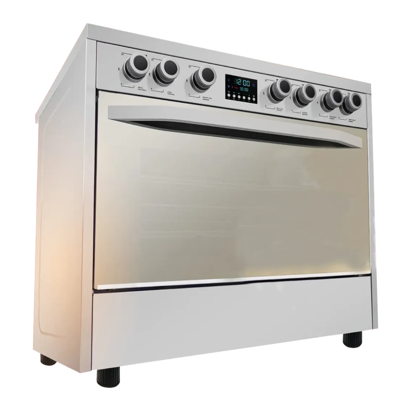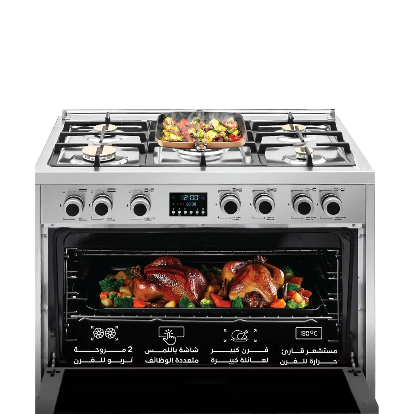 بوتاجاز 5 شعلة ستانلس بشاشة تاتش أنيقة، مروحتين تربو لتوزيع مثالي للحرارة، أمان كامل، دائرة غاز إيطالية، وحامل أواني زهر لمتانة إضافية