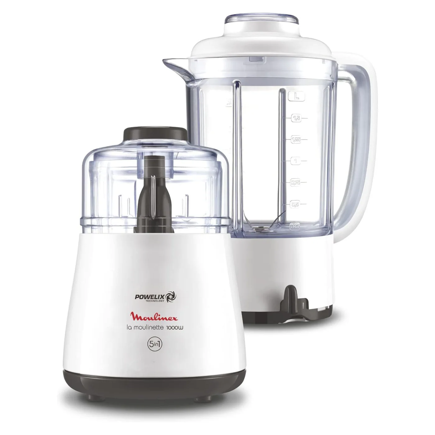 جهاز 2 في 1 عملي يجمع بين خلاط 1.5 لتر وكبة لامولينيت بقوة 1000 وات، لفرم المكونات الصلبة وخلط العصائر بكفاءة عالية.