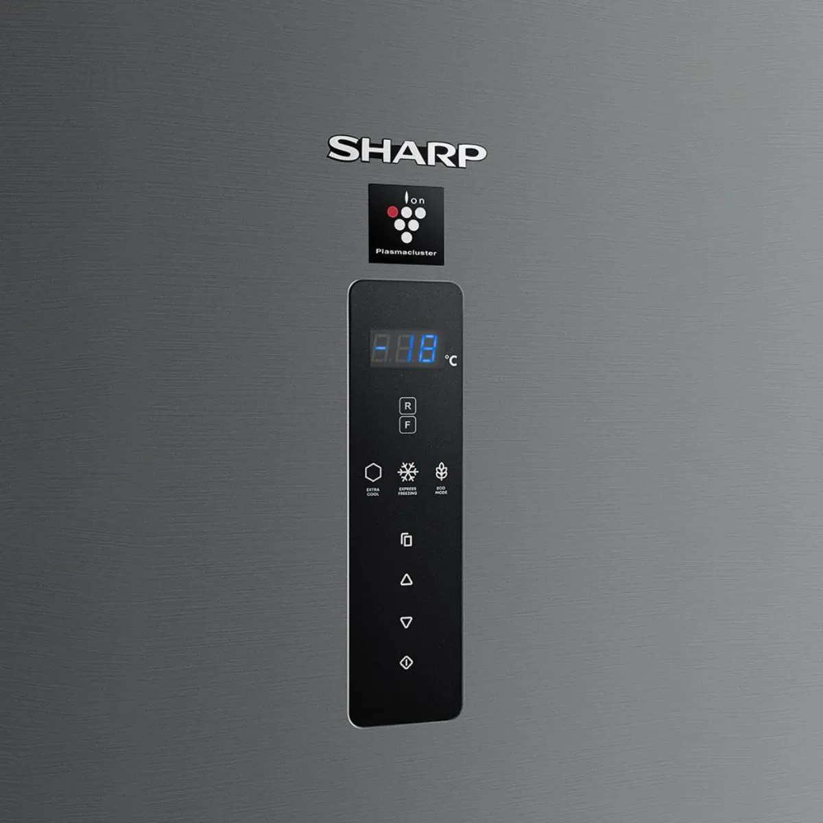 ثلاجة شارب نوفروست بسعة 558 لتر، بلون استانلس غامق أنيق وتصميم عملي بفريزر سفلي، مناسبة للعائلات الكبيرة. مزودة بتقنيات متقدمة مثل الانفرتر، البلازما كلاستر، شاشة تحكم ديجيتال، وأنظمة تبريد متعددة، مما يمنح المستخدم تجربة تبريد ذكية وفعالة مع الحفاظ على الطاقة.